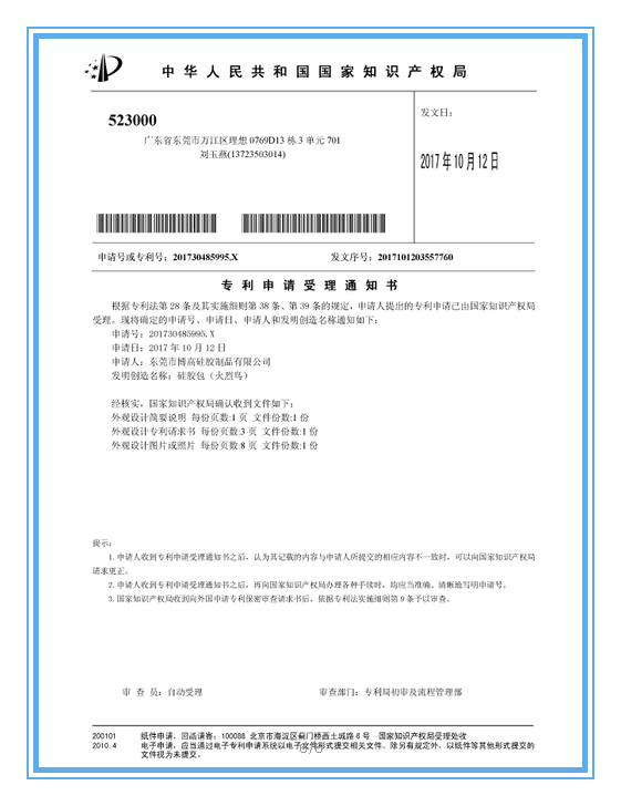 東莞市博高硅膠制品有限公司執(zhí)行集體領(lǐng)導(dǎo)、統(tǒng)籌管理、共同決策等戰(zhàn)略方針,取得了一些列成果,先后獲取了多項(xiàng)專利,這是企業(yè)上下齊心協(xié)力共同斬獲的公司榮譽(yù),如下所示: